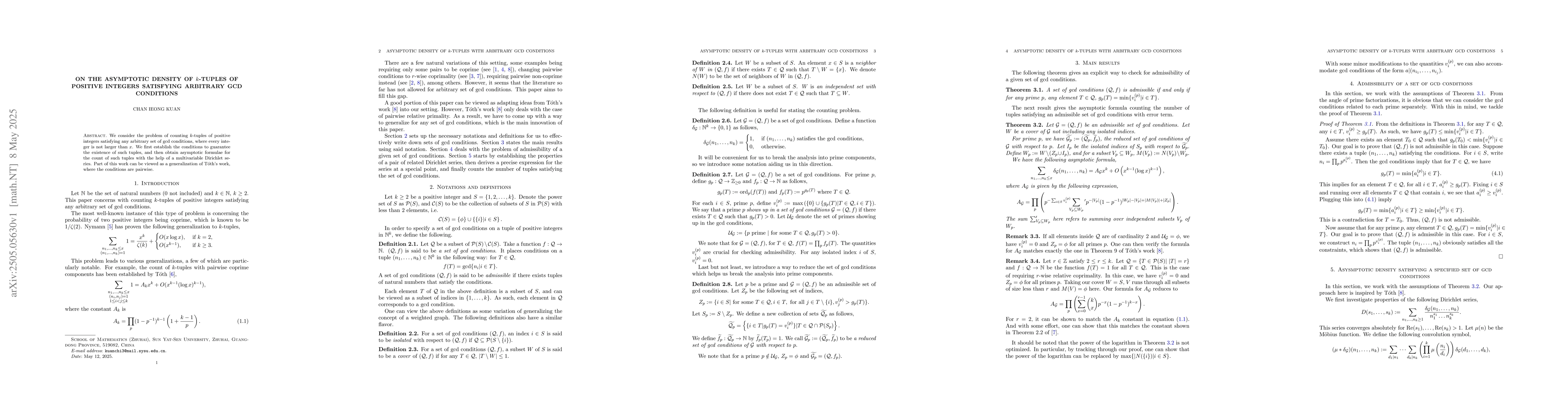The research employs multivariable Dirichlet series to establish conditions for the existence of k-tuples of positive integers satisfying arbitrary gcd conditions, and to derive asymptotic formulae for counting such tuples up to x.