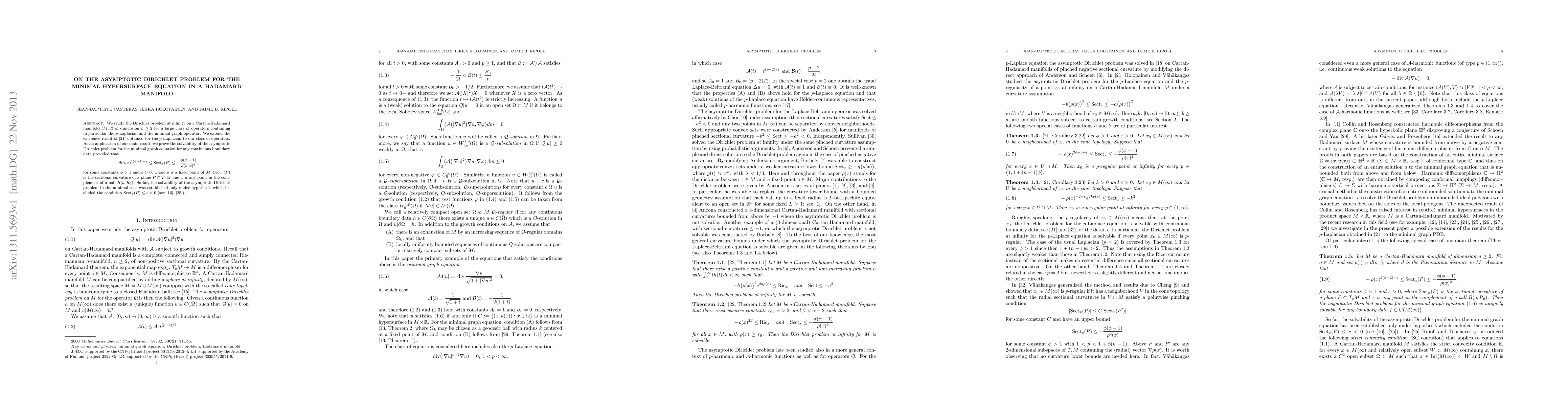 Summary: This paper investigates the asymptotic Dirichlet problem for minimal hypersurfaces in Cartan-Hadamard manifolds, focusing on a broad class of operators including the p-Laplacian and the minimal graph operator. The study aims to understand the behavior of solutions at infinity.