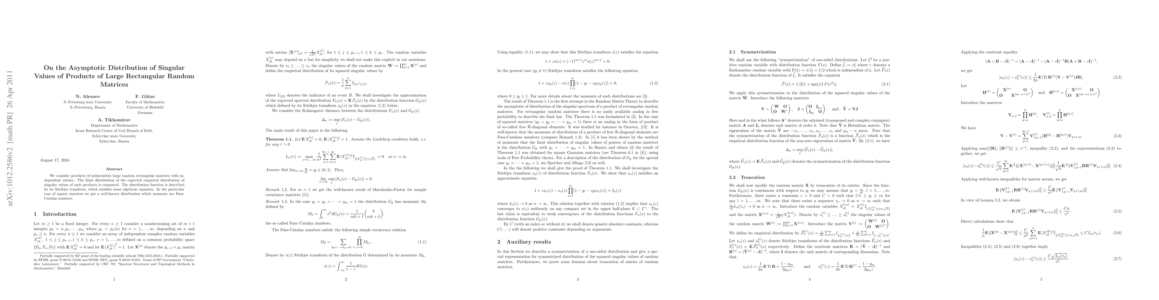 This paper examines the asymptotic distribution of singular values in products of large independent random rectangular matrices, revealing a distribution described by its Stieltjes transform and satisfying an algebraic equation, with square matrices resulting in well-known Fuss-Catalan moments.