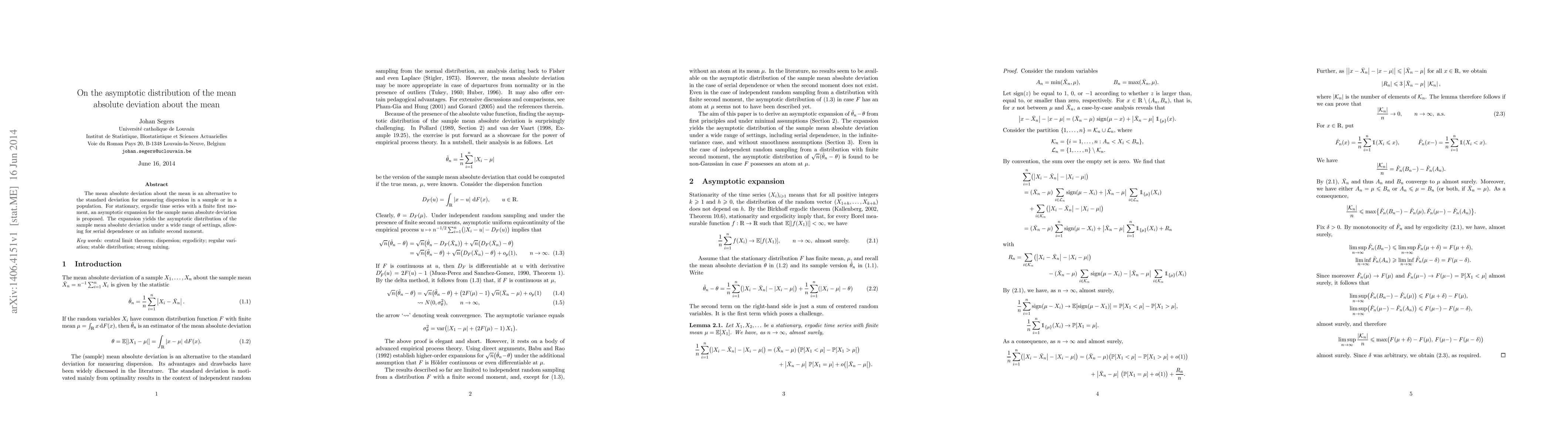 This paper proposes an asymptotic expansion for the sample mean absolute deviation about the mean in stationary, ergodic time series, providing its asymptotic distribution under various conditions, including serial dependence and infinite second moments. The method offers a robust alternative to the standard deviation for measuring dispersion.