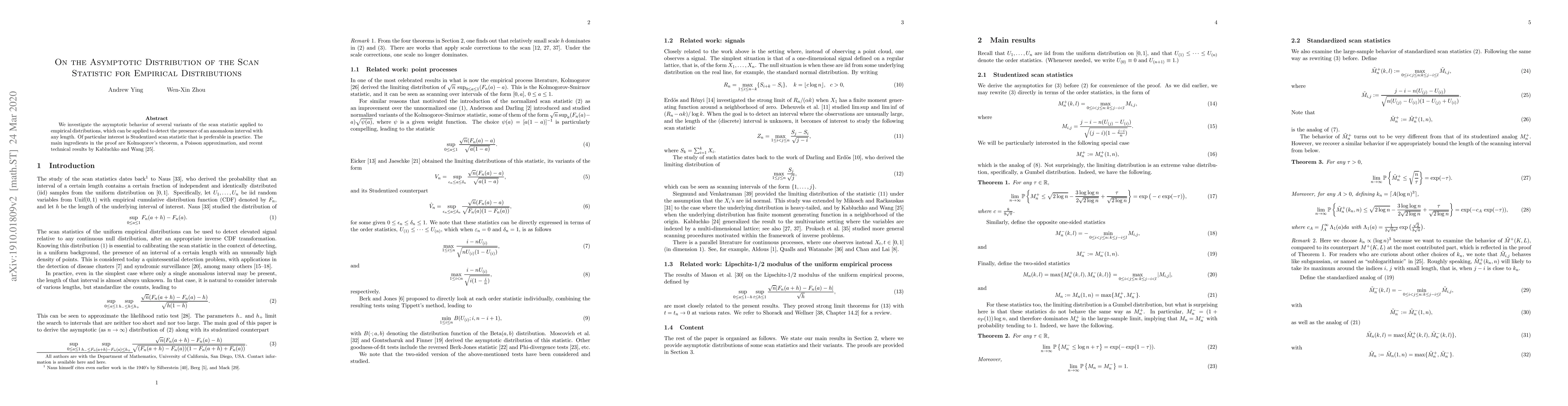 This paper examines the asymptotic distribution of the scan statistic for empirical distributions, focusing on the Studentized variant for detecting anomalous intervals. The analysis leverages Kolmogorov's theorem, Poisson approximation, and recent technical results to establish its practical applicability.