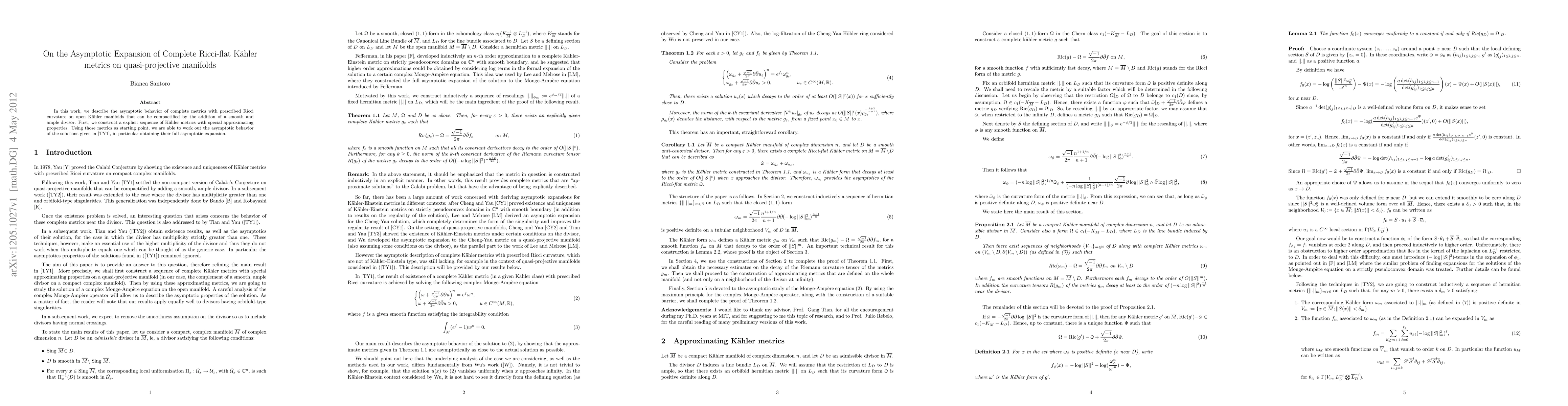 This paper constructs explicit sequences of Ricci-flat Kahler metrics on quasi-projective manifolds with prescribed Ricci curvature and provides their full asymptotic expansion, building on the foundational work of Tian-Yau.