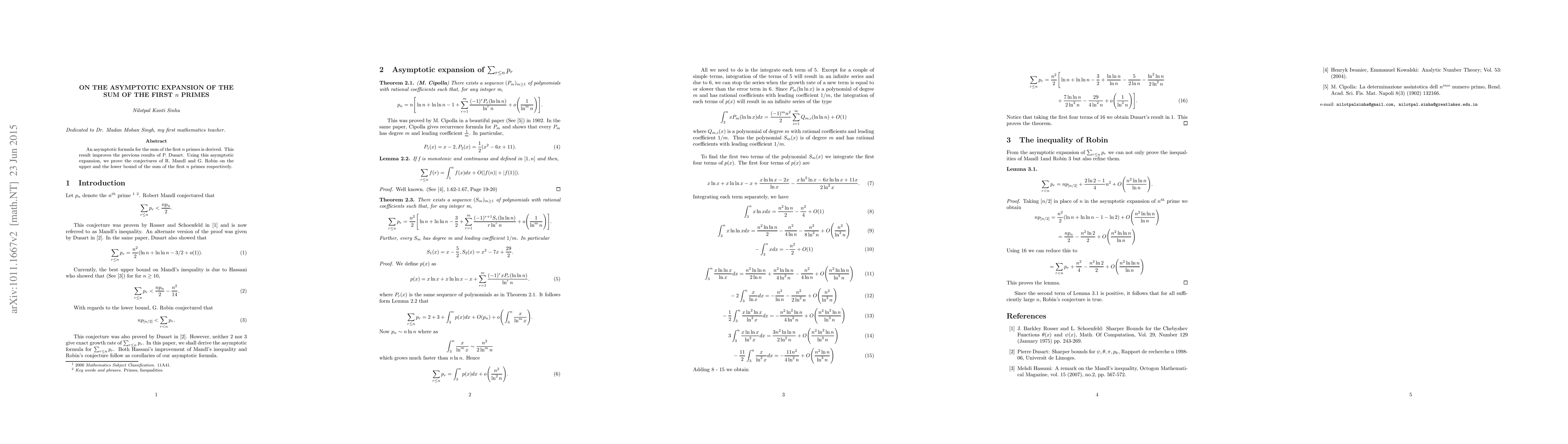 An asymptotic formula for the sum of the first n primes is derived. This result improves the previous results of P. Dusart. Using this asymptotic expansion, we prove the conjectures of R. Mandl and G. Robin on the upper and the lower bound of the sum of the first n primes respectively.