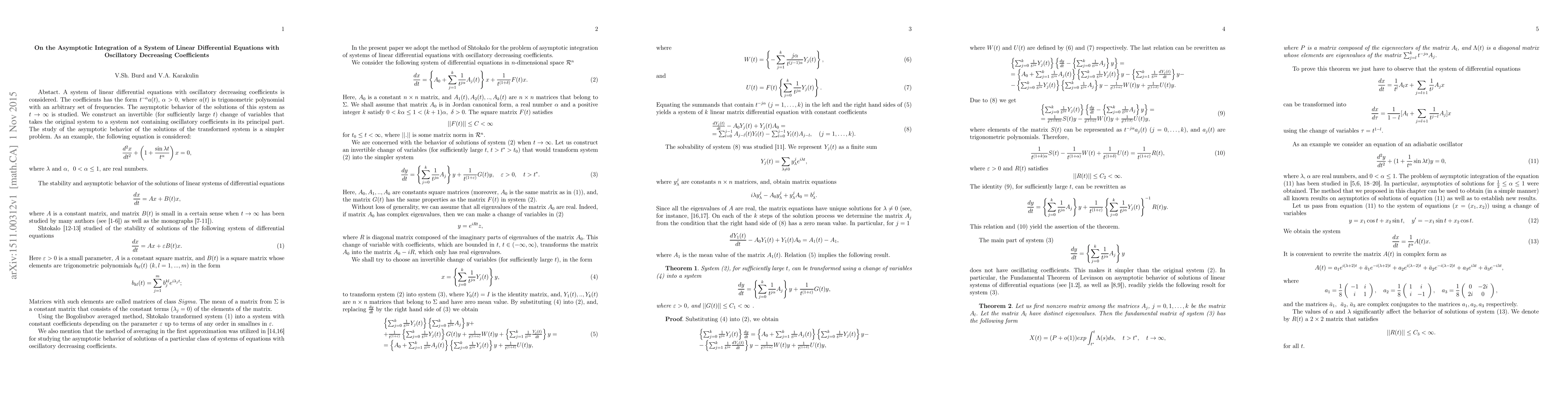 This paper studies the asymptotic behavior of solutions to a system of linear differential equations with oscillatory decreasing coefficients. It introduces a change of variables that simplifies the problem and captures the essence of the original system's behavior as t approaches infinity.