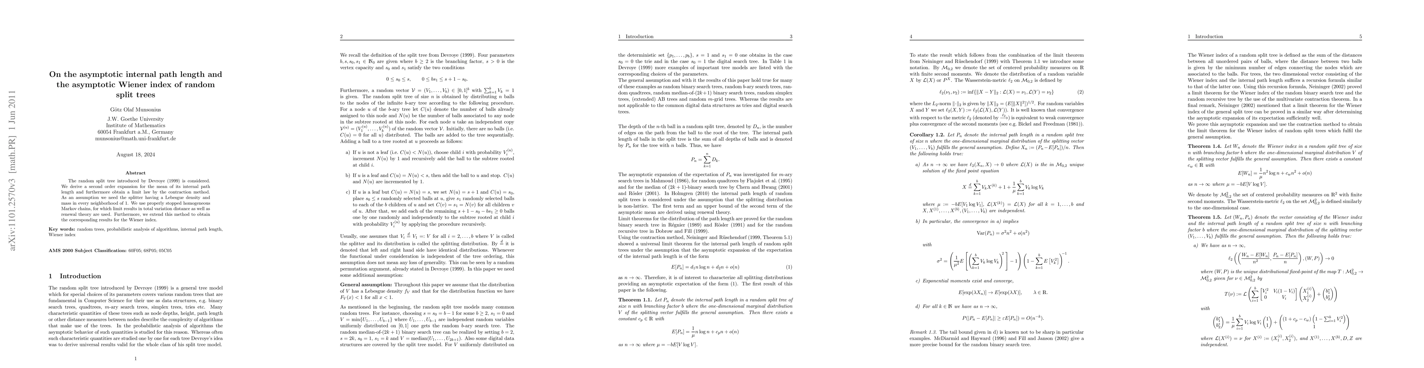The random split tree introduced by Devroye (1999) is considered. We derive a second order expansion for the mean of its internal path length and furthermore obtain a limit law by the contraction method. As an assumption we need the splitter having a Lebesgue density and mass in every neighborhood of 1. We use properly stopped homogeneous Markov chains, for which limit results in total variation distance as well as renewal theory are used. Furthermore, we extend this method to obtain the corresponding results for the Wiener index.