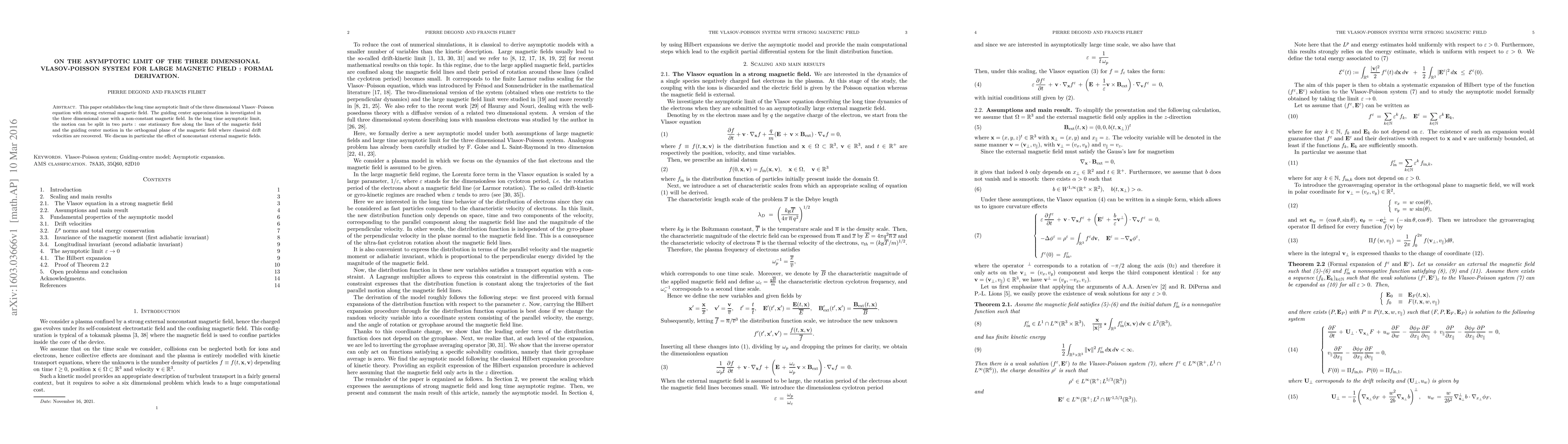 This paper establishes the long time asymptotic limit of the three dimensional Vlasov-Poisson equation with strong external magnetic field. The guiding center approximation is investigated in the three dimensional case with a non-constant magnetic field. In the long time asymptotic limit, the motion can be split in two parts : one stationary flow along the lines of the magnetic field and the guiding center motion in the orthogonal plane of the magnetic field where classical drift velocities are recovered. We discuss in particular the effect of nonconstant external magnetic fields.