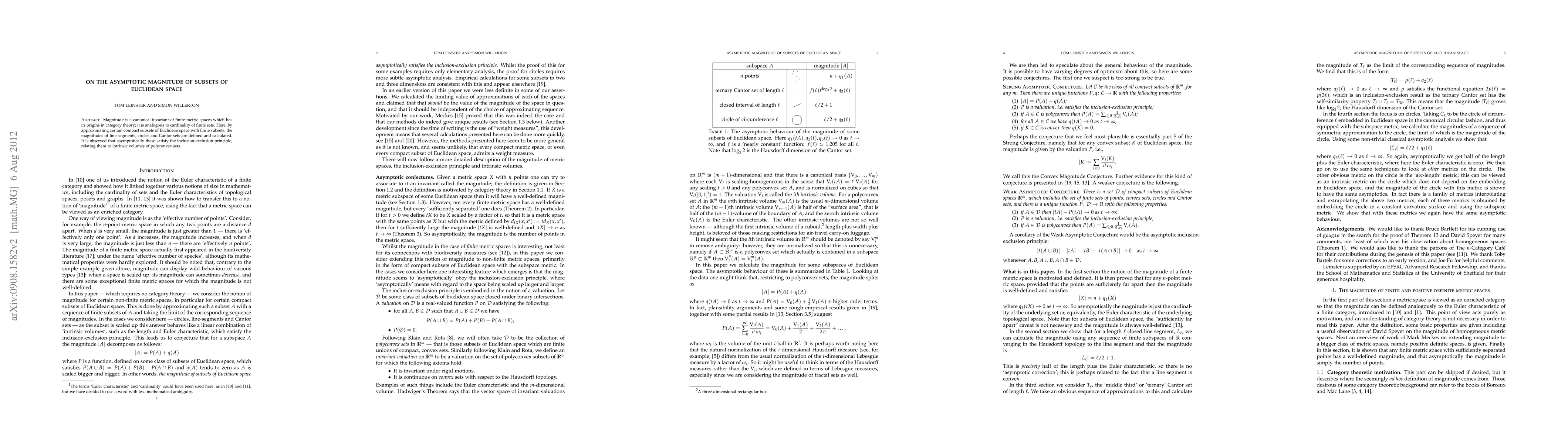 The research approximates compact subsets of Euclidean space with finite subsets to define and calculate magnitudes, observing that they asymptotically satisfy the inclusion-exclusion principle related to intrinsic volumes of polyconvex sets.