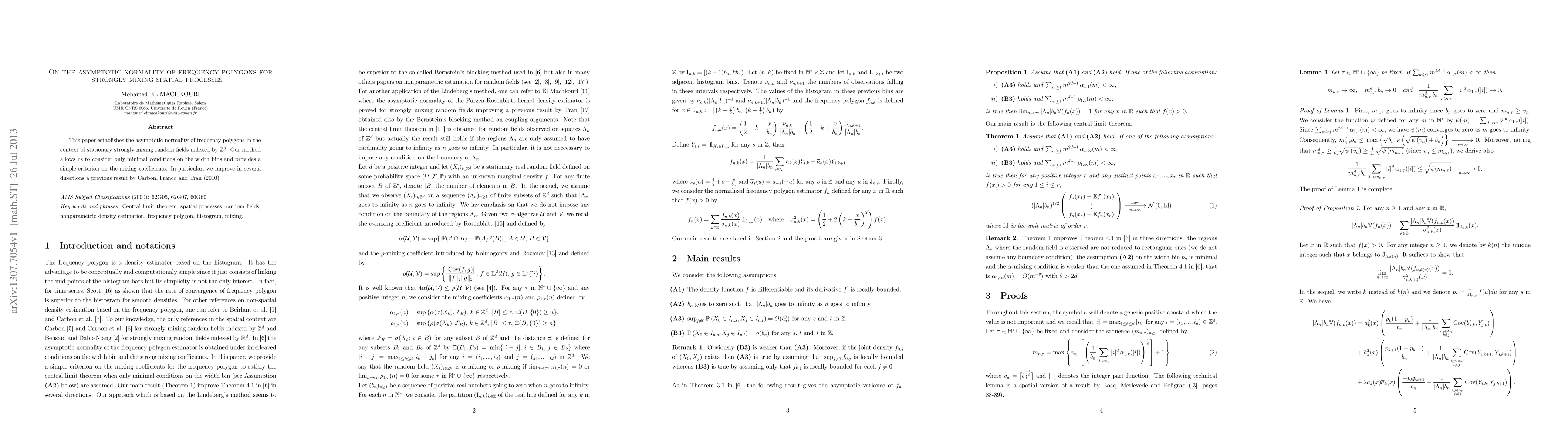 This paper proves the asymptotic normality of frequency polygons for stationary strongly mixing random fields, requiring minimal conditions on bin widths and offering a straightforward criterion based on mixing coefficients. It enhances a prior result by Carbon, Francq, and Tran (2010).