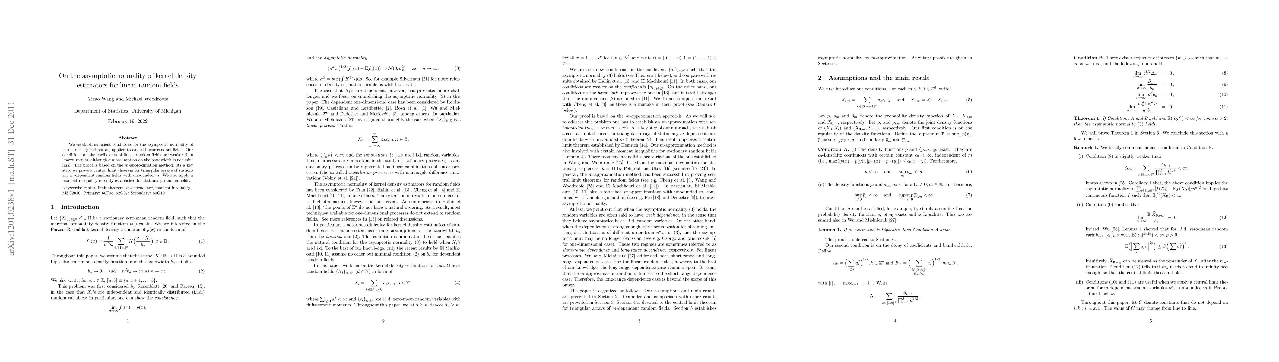 This paper establishes sufficient conditions for the asymptotic normality of kernel density estimators for causal linear random fields, with weaker conditions on the coefficients than previous results. The proof utilizes the $m$-approximation method and includes a central limit theorem for triangular arrays of stationary $m$-dependent random fields.