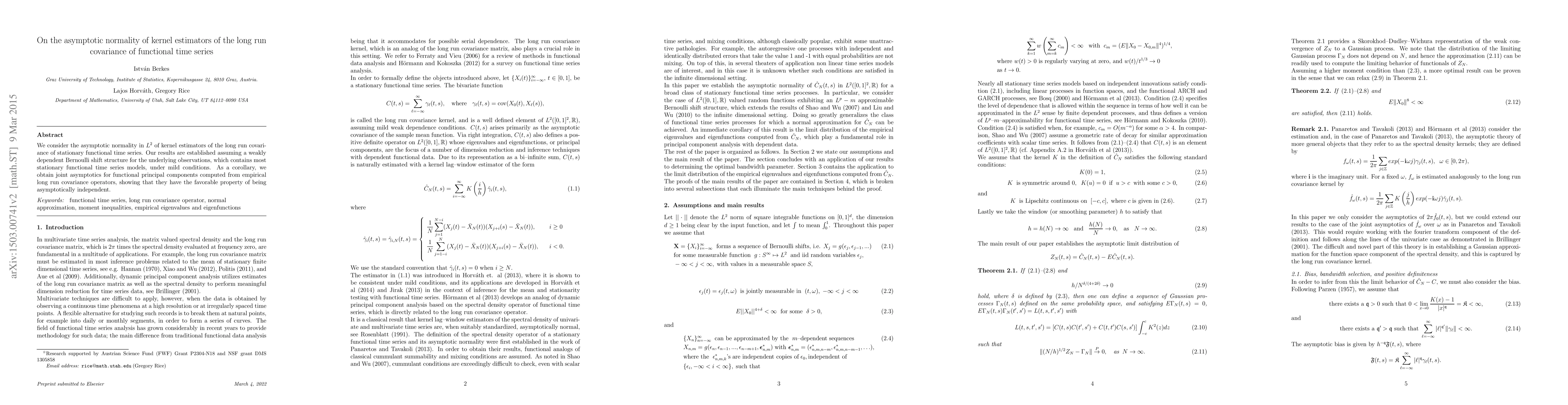 This paper establishes the asymptotic normality of kernel estimators for the long run covariance kernel of stationary functional time series under a weakly dependent Bernoulli shift structure. It also demonstrates the asymptotic independence of functional principal components derived from empirical long run covariance operators.