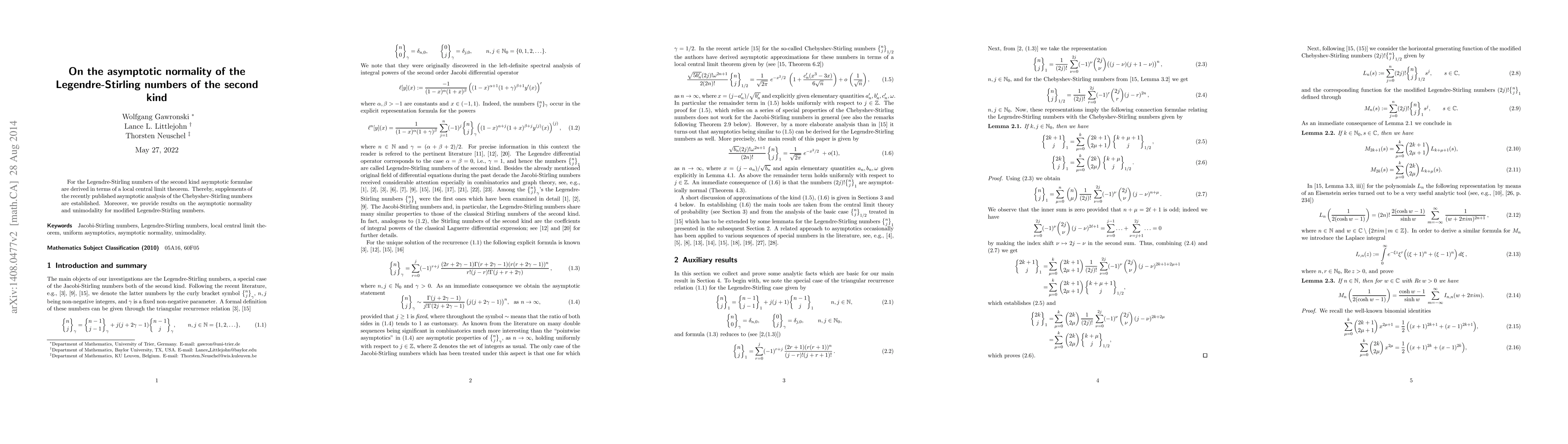 This paper derives asymptotic formulae for Legendre-Stirling numbers of the second kind using a local central limit theorem, extending recent analyses of Chebyshev-Stirling numbers. It also presents results on the asymptotic normality and unimodality of modified Legendre-Stirling numbers.