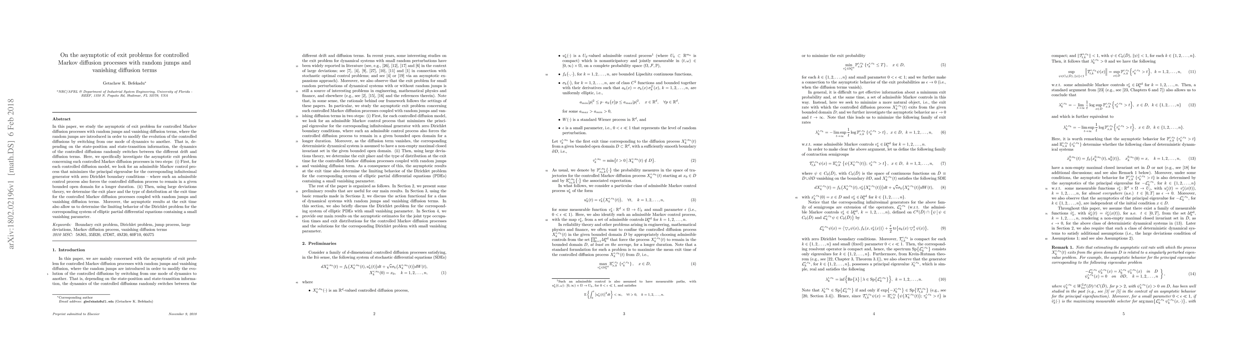This paper investigates the asymptotic behavior of exit problems for controlled Markov diffusion processes with random jumps and diminishing diffusion terms. It focuses on finding an optimal control process to minimize the principal eigenvalue and uses large deviations theory to determine the exit location and distribution for these processes.