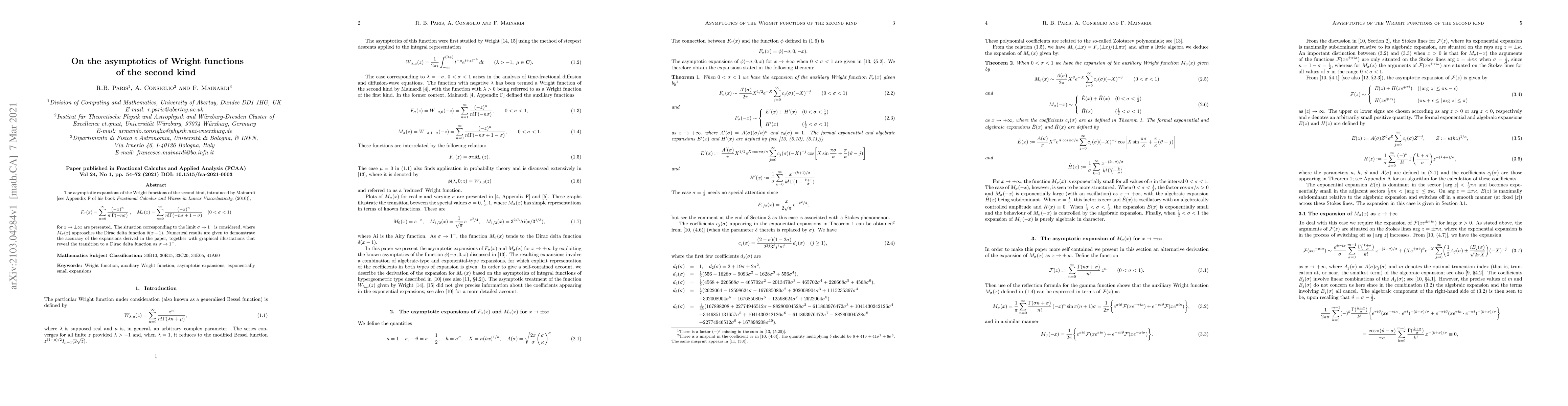 The asymptotic expansions of the Wright functions of the second kind, introduced by Mainardi [see Appendix F of his book {\it Fractional Calculus and Waves in Linear Viscoelasticity}, (2010)], $$ F_\sigma(x)=\sum_{n=0}^\infty \frac{(-x)^n}{n! \g(-n\sigma)}~,\quad M_\sigma(x)=\sum_{n=0}^\infty \frac{(-x)^n}{n! \g(-n\sigma+1-\sigma)}\quad(0<\sigma<1)$$ for $x\to\pm\infty$ are presented. The situation corresponding to the limit $\sigma\to1^-$ is considered, where $M_\sigma(x)$ approaches the Dirac delta function $\delta(x-1)$. Numerical results are given to demonstrate the accuracy of the expansions derived in the paper, together with graphical illustrations that reveal the transition to a Dirac delta function as $\sigma\to 1^-$.