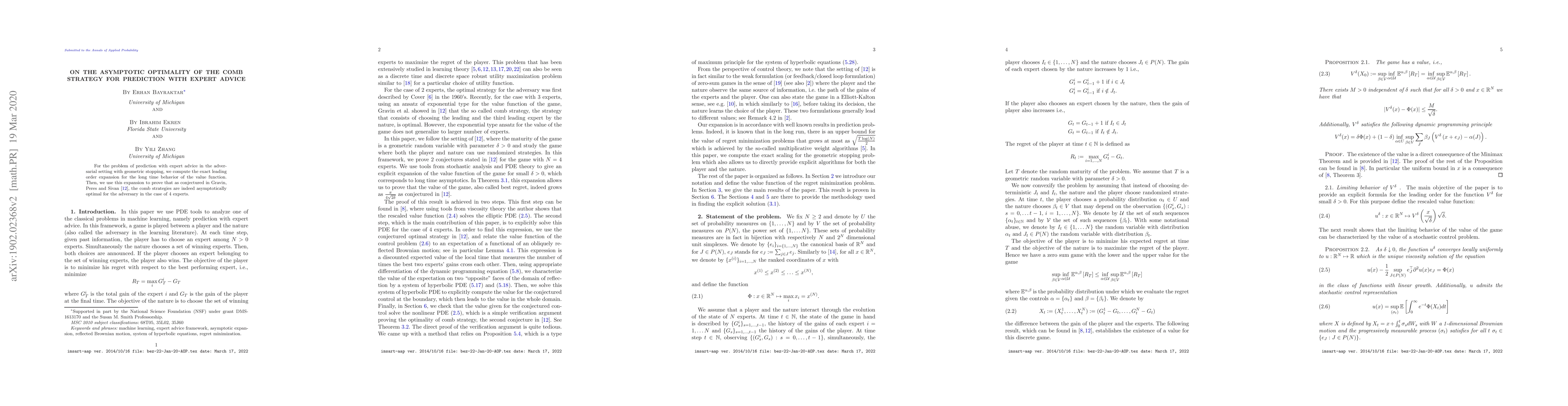 For the problem of prediction with expert advice in the adversarial setting with geometric stopping, we compute the exact leading order expansion for the long time behavior of the value function. Then, we use this expansion to prove that as conjectured in Gravin et al. [12], the comb strategies are indeed asymptotically optimal for the adversary in the case of 4 experts.