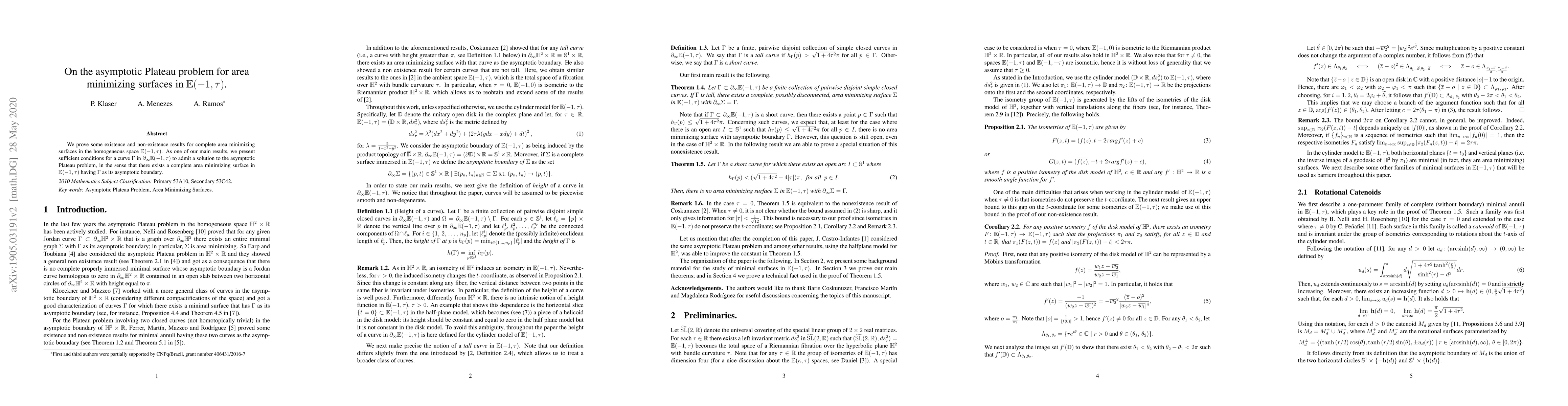 We prove some existence and non-existence results for complete area minimizing surfaces in the homogeneous space $\mathbb{E}(-1,\tau)$. As one of our main results, we present sufficient conditions for a curve $\Gamma$ in $\partial_{\infty} \mathbb{E}(-1,\tau)$ to admit a solution to the asymptotic Plateau problem, in the sense that there exists a complete area minimizing surface in $\mathbb{E}(-1,\tau)$ having $\Gamma$ as its asymptotic boundary.