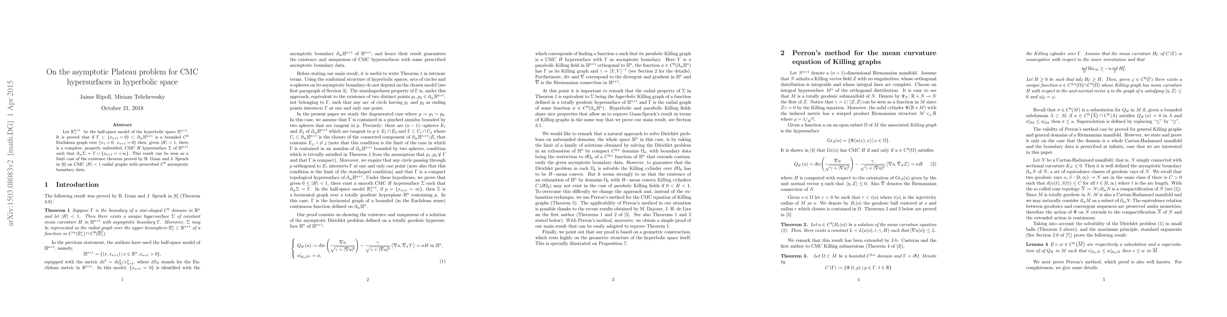 Let $\mathbb{R}_{+}^{n+1}$ \ be the half-space model of the hyperbolic space $\mathbb{H}^{n+1}.$ It is proved that if $\Gamma\subset\left\{ x_{n+1}=0\right\} \subset\partial_{\infty}\mathbb{H}^{n+1}$ is a bounded $C^{0}$ Euclidean graph over $\left\{ x_{1}=0,\text{ }x_{n+1}=0\right\} $ then, given $\left\vert H\right\vert <1,$ there is a complete, properly embedded, CMC $H$ hypersurface $\Sigma$ of $\mathbb{H}^{n+1}$ such that $\partial_{\infty }S=\Gamma\cup\left\{ x_{n+1}=+\infty\right\} .$ This result can be seen as a limit case of the existence theorem proved by B. Guan and J. Spruck in \cite{GS} on CMC $\left\vert H\right\vert <1$ radial graphs with prescribed $C^{0}$ asymptotic boundary data.