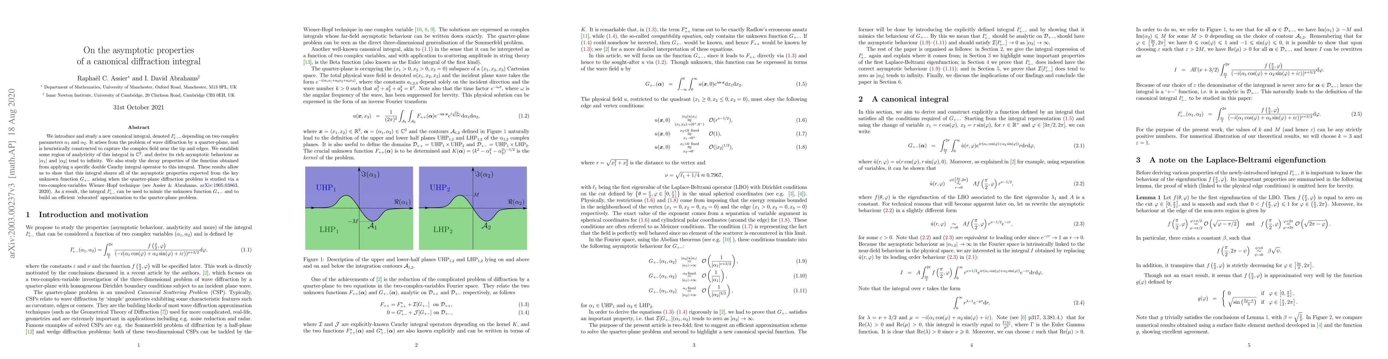 We introduce and study a new canonical integral, denoted $I_{+-}^{\varepsilon}$, depending on two complex parameters $\alpha_1$ and $\alpha_2$. It arises from the canonical problem of wave diffraction by a quarter-plane, and is heuristically constructed to capture the complex field near the tip and edges. We establish some region of analyticity of this integral in $\mathbb{C}^2$, and derive its rich asymptotic behaviour as $|\alpha_1|$ and $|\alpha_2 |$ tend to infinity. We also study the decay properties of the function obtained from applying a specific double Cauchy integral operator to this integral. These results allow us to show that this integral shares all of the asymptotic properties expected from the key unknown function $G_{+-}$ arising when the quarter-plane diffraction problem is studied via a two-complex-variables Wiener--Hopf technique (see Assier \& Abrahams, arXiv:1905.03863, 2020). As a result, the integral $I_{+ -}^{\varepsilon}$ can be used to mimic the unknown function $G_{+ -}$ and to build an efficient `educated' approximation to the quarter-plane problem.