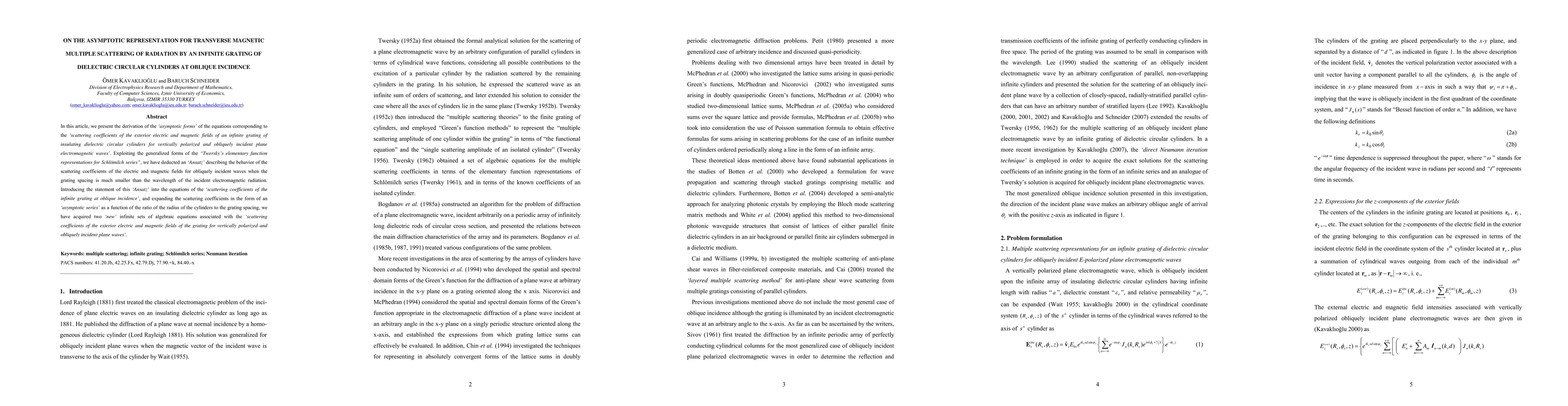 This paper derives asymptotic forms for scattering coefficients of an infinite grating of dielectric circular cylinders under oblique incidence of vertically polarized electromagnetic waves. It introduces an Ansatz based on Twersky's elementary function representations, leading to new infinite sets of algebraic equations for the exterior electric and magnetic fields.