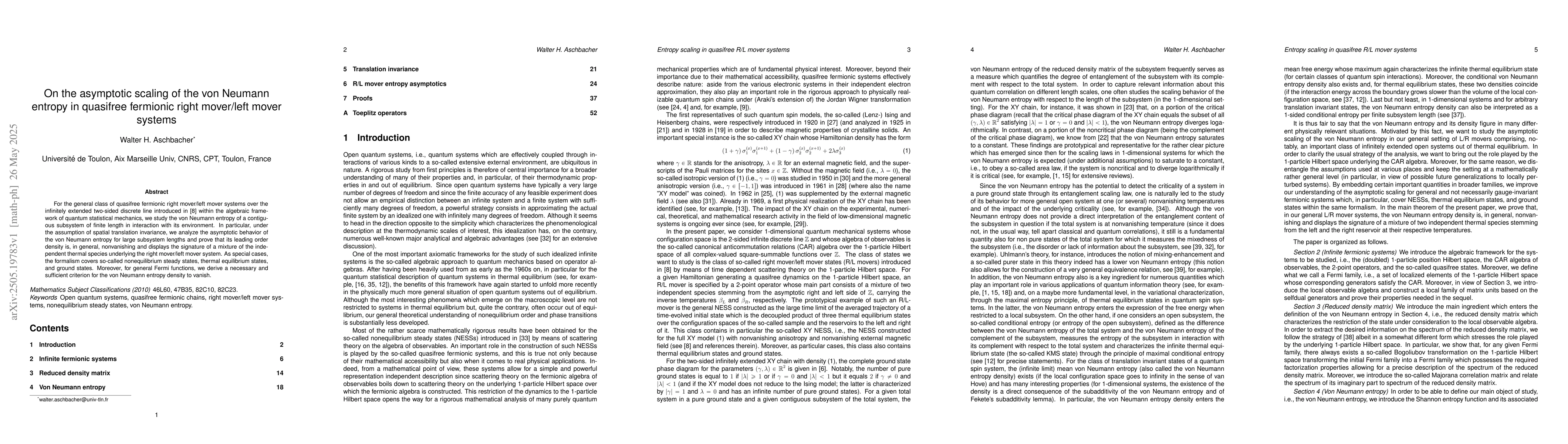 The paper presents a detailed analysis of the asymptotic scaling of von Neumann entropy in quasifree fermionic systems, providing criteria for entropy density vanishing and covering various types of quantum states.
