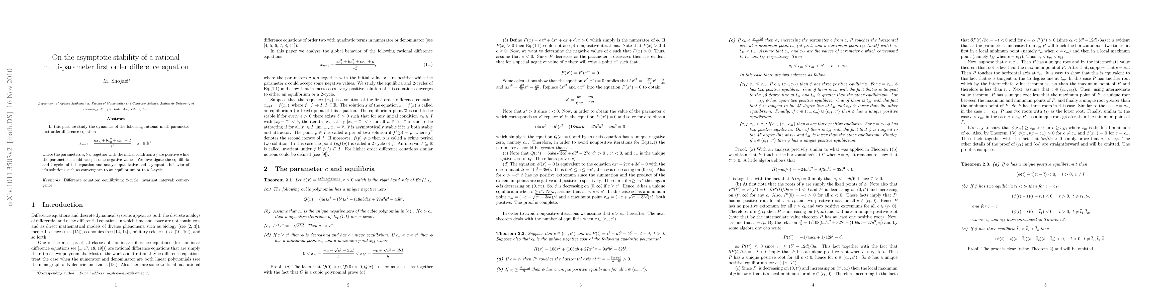 This paper examines the dynamics of a rational multi-parameter first order difference equation, focusing on the asymptotic stability and qualitative behavior of its solutions, including equilibria and 2-cycles, under various parameter conditions. The study analyzes convergence properties of the equation's solutions.