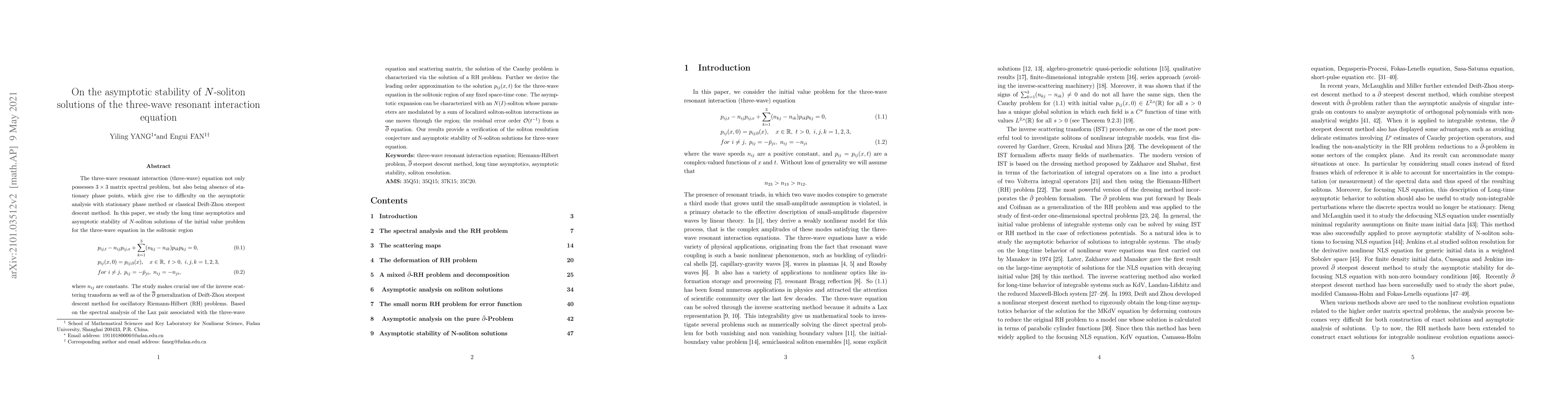 This paper investigates the long-time asymptotics and stability of $N$-soliton solutions for the three-wave resonant interaction equation, employing the inverse scattering transform and $\overline\partial$ generalization of Deift-Zhou steepest descent method. The study verifies the soliton resolution conjecture and confirms the asymptotic stability of $N$-soliton solutions.