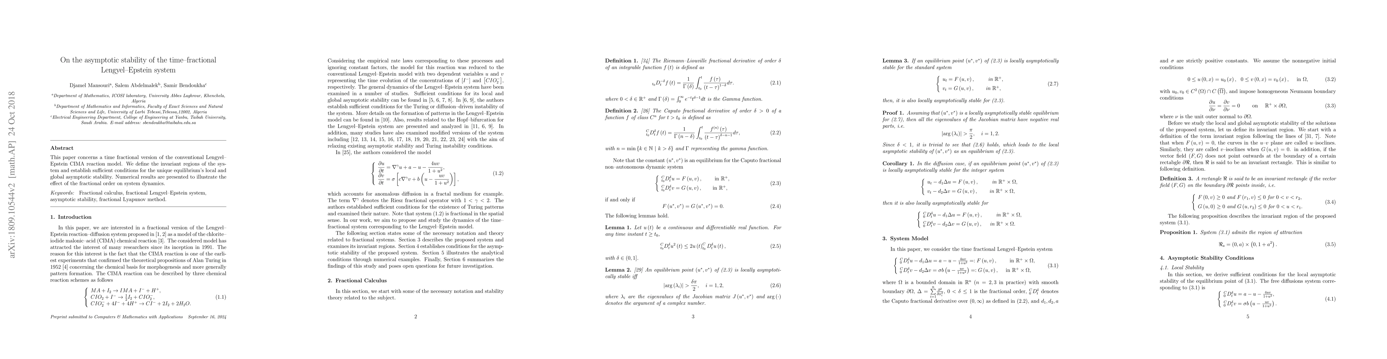 This paper concerns a time fractional version of the conventional Lengyel--Epstein CIMA reaction model. We define the invariant regions of the system and establish sufficient conditions for the unique equilibrium's local and global asymptotic stability. Numerical results are presented to illustrate the effect of the fractional order on system dynamics.
