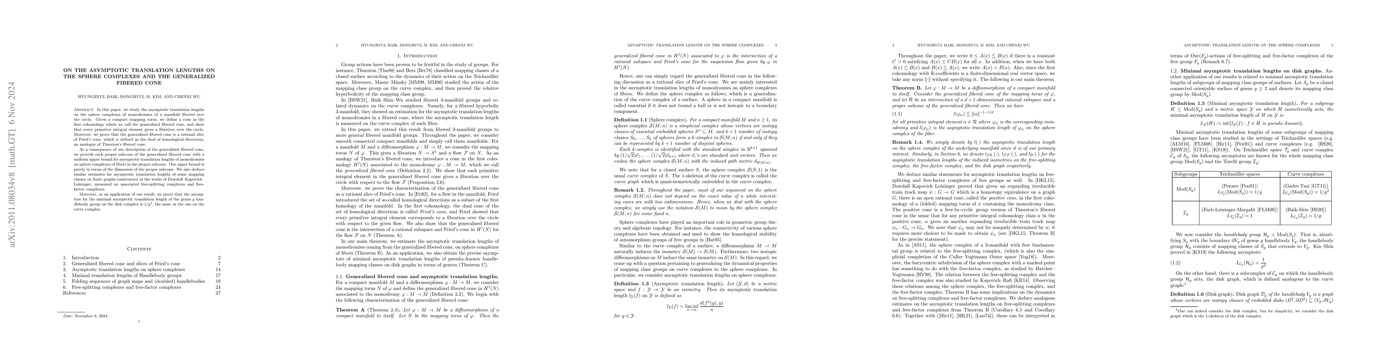 This paper investigates asymptotic translation lengths on sphere complexes and introduces a generalized fibered cone for compact mapping tori. It establishes bounds for these lengths based on the dimension of the maximal slice of the cone, and applies these results to 4-dimensional mapping tori, deriving estimates for $\mathrm{Out}(F_g)$-actions and minimal asymptotic translation lengths of handlebody groups.