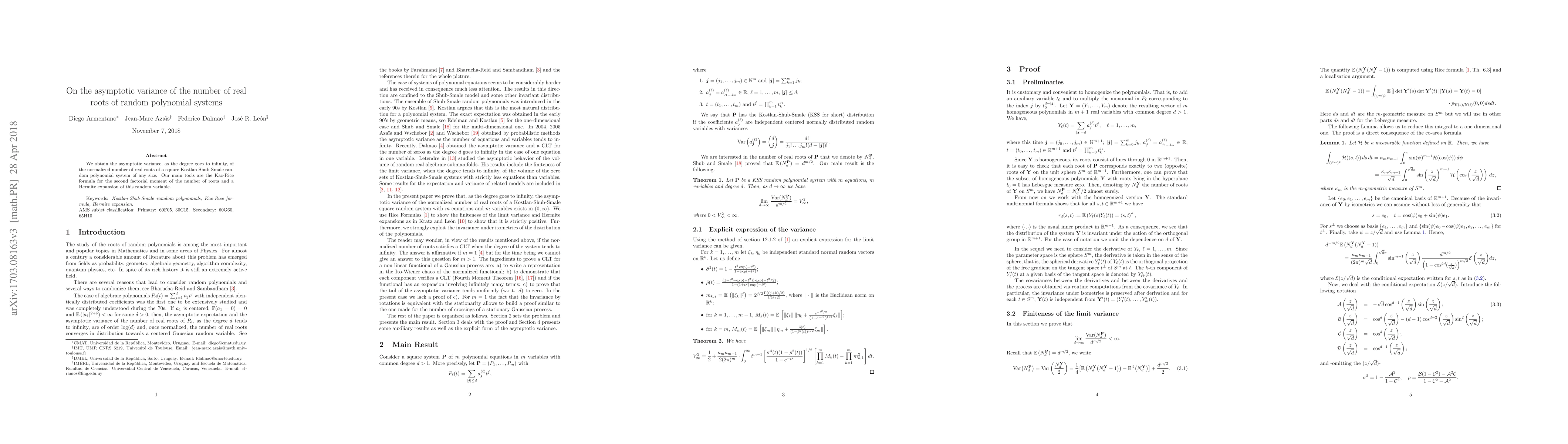 This paper determines the asymptotic variance of the normalized number of real roots in a large Kostlan-Shub-Smale random polynomial system, utilizing the Kac-Rice formula and Hermite expansion techniques to achieve this result.