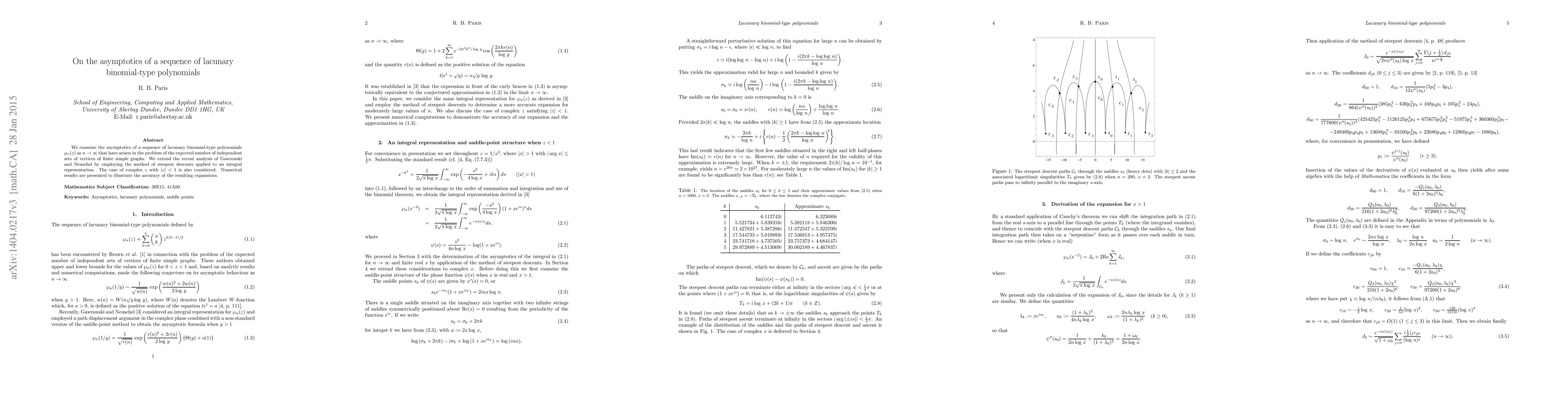 We examine the asymptotics of a sequence of lacunary binomial-type polynomials $\wp_n(z)$ as $n\rightarrow\infty$ that have arisen in the problem of the expected number of independent sets of vertices of finite simple graphs. We extend the recent analysis of Gawronski and Neuschel by employing the method of steepest descents applied to an integral representation. The case of complex $z$ with $|z|<1$ is also considered. Numerical results are presented to illustrate the accuracy of the resulting expansions.