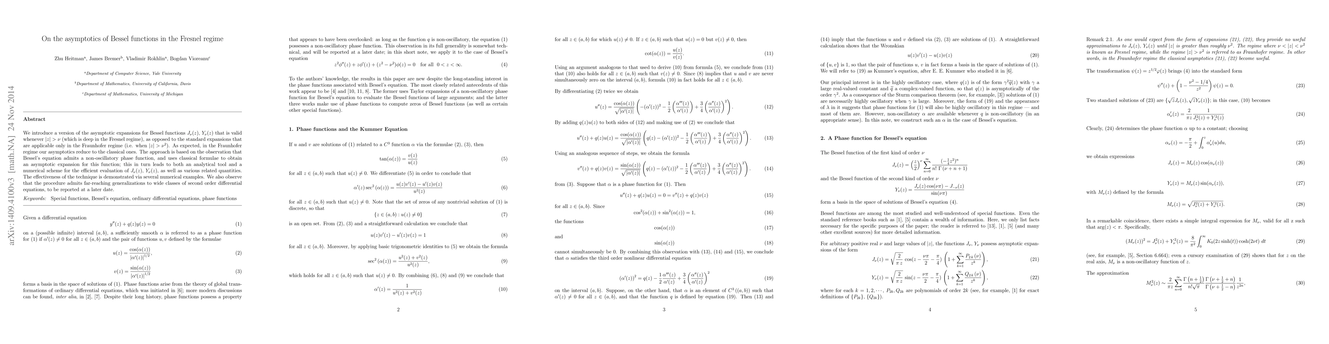 We introduce a version of the asymptotic expansions for Bessel functions $J_\nu(z)$, $Y_\nu(z)$ that is valid whenever $|z| > \nu$ (which is deep in the Fresnel regime), as opposed to the standard expansions that are applicable only in the Fraunhofer regime (i.e. when $|z| > \nu^2$). As expected, in the Fraunhofer regime our asymptotics reduce to the classical ones. The approach is based on the observation that Bessel's equation admits a non-oscillatory phase function, and uses classical formulas to obtain an asymptotic expansion for this function; this in turn leads to both an analytical tool and a numerical scheme for the efficient evaluation of $J_\nu(z)$, $Y_\nu(z)$, as well as various related quantities. The effectiveness of the technique is demonstrated via several numerical examples. We also observe that the procedure admits far-reaching generalizations to wide classes of second order differential equations, to be reported at a later date.