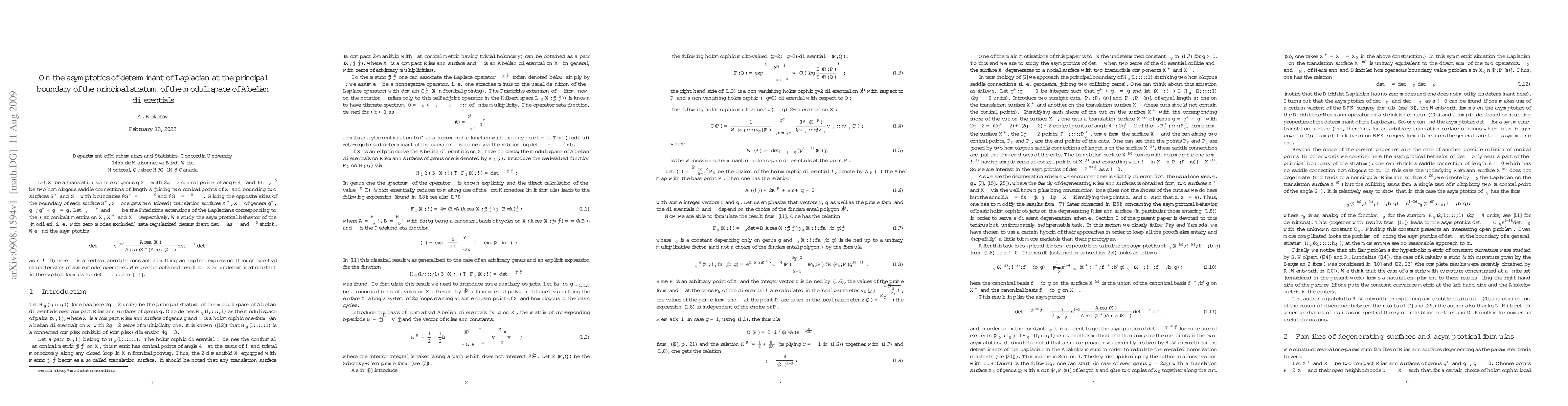We study the asymptotics of the determinant of Laplacian on a translation surface (a compact Riemann surface equipped with a conformal flat conical metric with trivial holonomy) of genus g with 2g-2 conical points of angle 4\pi as two conical points collide.