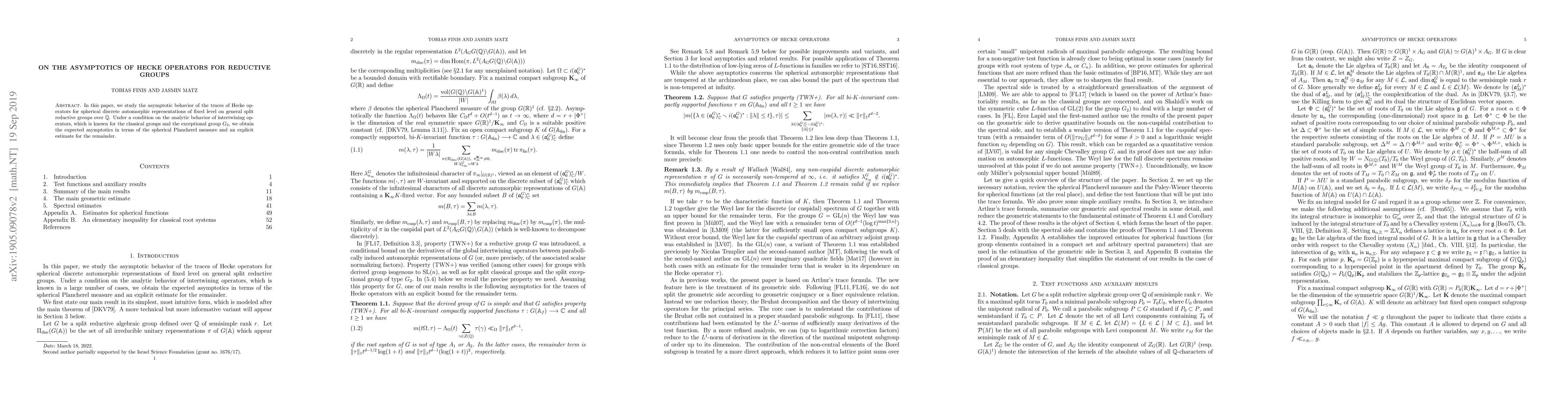 This paper investigates the asymptotic behavior of Hecke operator traces for spherical discrete automorphic representations on split reductive groups over $\mathbb{Q}$. It provides expected asymptotics under a condition on intertwining operators, with an explicit remainder estimate.