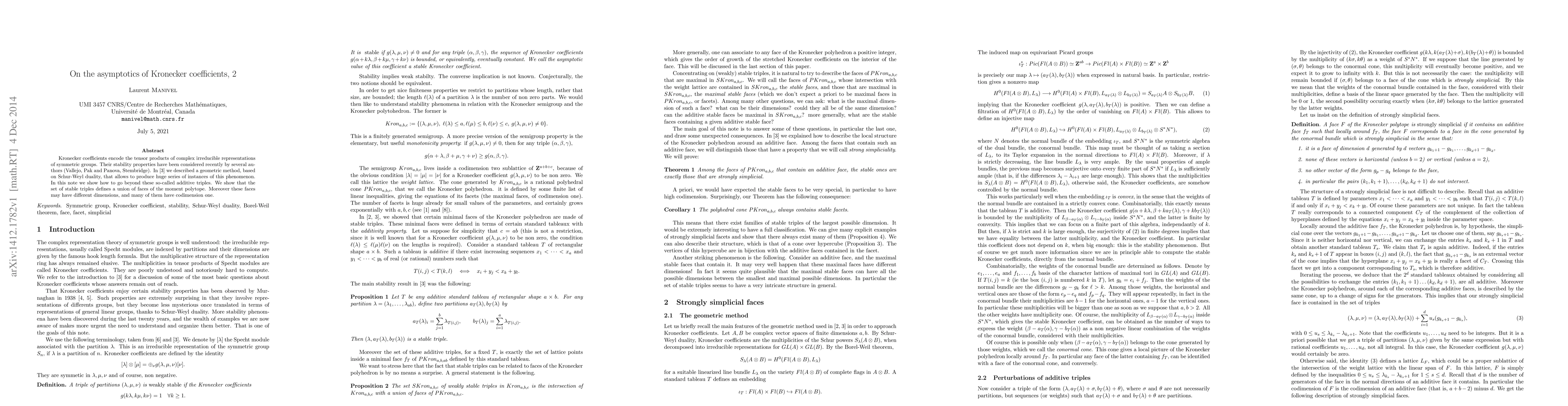 Kronecker coefficients encode the tensor products of complex irreducible representations of symmetric groups. Their stability properties have been considered recently by several authors (Vallejo, Pak and Panova, Stembridge). In previous works we described a geometric method, based on Schur-Weyl duality, that allows to produce huge series of instances of this phenomenon. In this note we show how to go beyond these so-called additive triples. We show that the set of stable triples defines a union of faces of the moment polytope. Moreover these faces may have different dimensions, and many of them have codimension one.