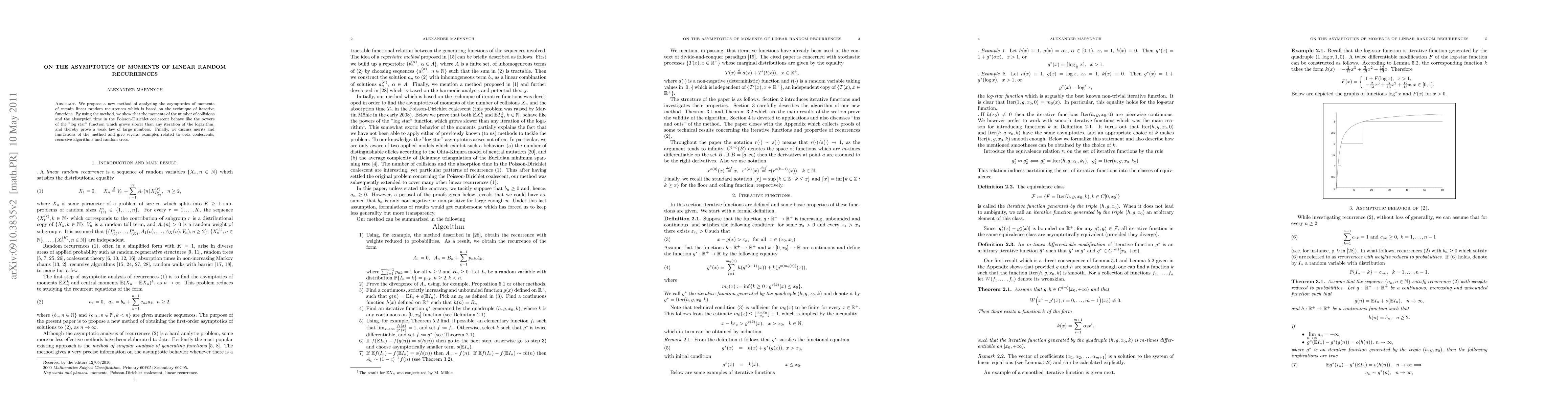 We propose a new method of analyzing the asymptotics of moments of certain linear random recurrences which is based on the technique of iterative functions. By using the method, we show that the moments of the number of collisions and the absorption time in the Poisson-Dirichlet coalescent behave like the powers of the "log star" function which grows slower than any iteration of the logarithm, and thereby prove a weak law of large numbers. Finally, we discuss merits and limitations of the method and give several examples related to beta coalescents, recursive algorithms and random trees.