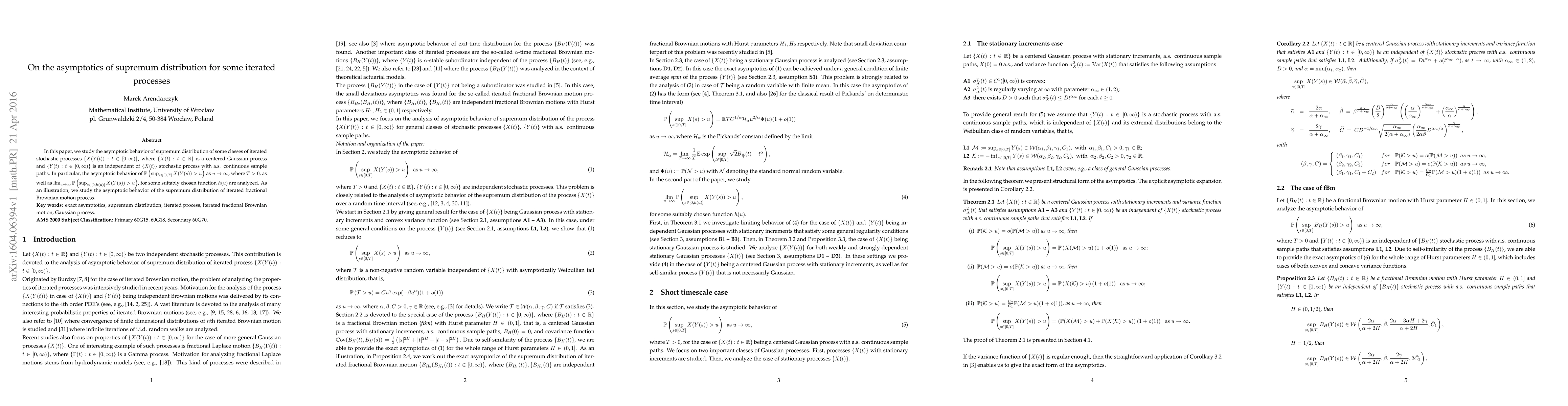 This paper investigates the asymptotic behavior of supremum distribution for iterated stochastic processes, focusing on the probability $\mathbb{P}\left(\sup_{s \in [0,T]} X(Y(s)) > u\right)$ as $u \to \infty$, where $X$ is a centered Gaussian process and $Y$ is an independent stochastic process. It also examines the supremum distribution for iterated fractional Brownian motion.