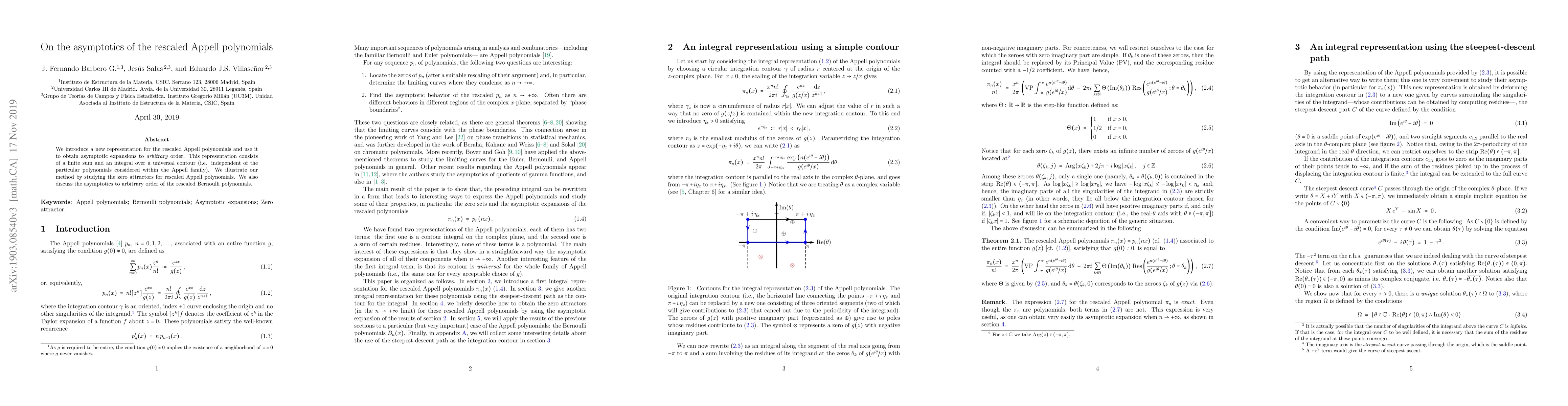 We introduce a new representation for the rescaled Appell polynomials and use it to obtain asymptotic expansions to arbitrary order. This representation consists of a finite sum and an integral over a universal contour (i.e. independent of the particular polynomials considered within the Appell family). We illustrate our method by studying the zero attractors for rescaled Appell polynomials. We also discuss the asymptotics to arbitrary order of the rescaled Bernoulli polynomials.