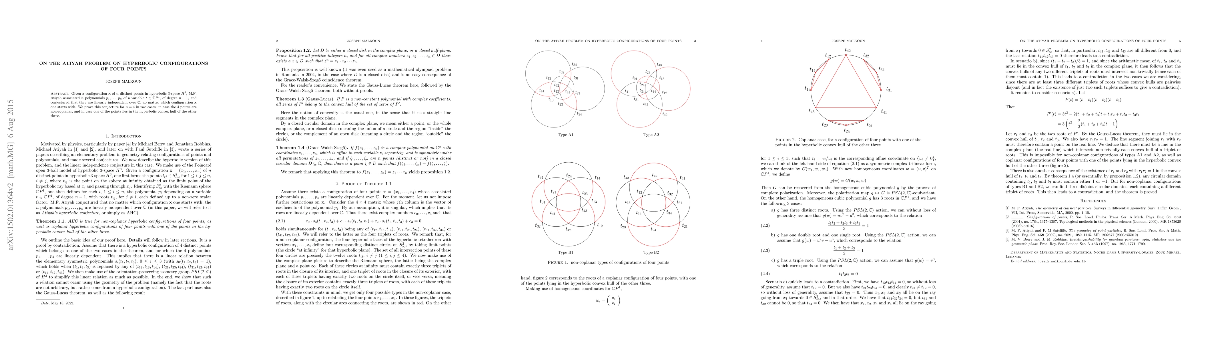 This paper resolves Atiyah's conjecture for hyperbolic configurations of four points in 3-space, proving linear independence for two cases: non-coplanar points and a point inside the convex hull of three others.