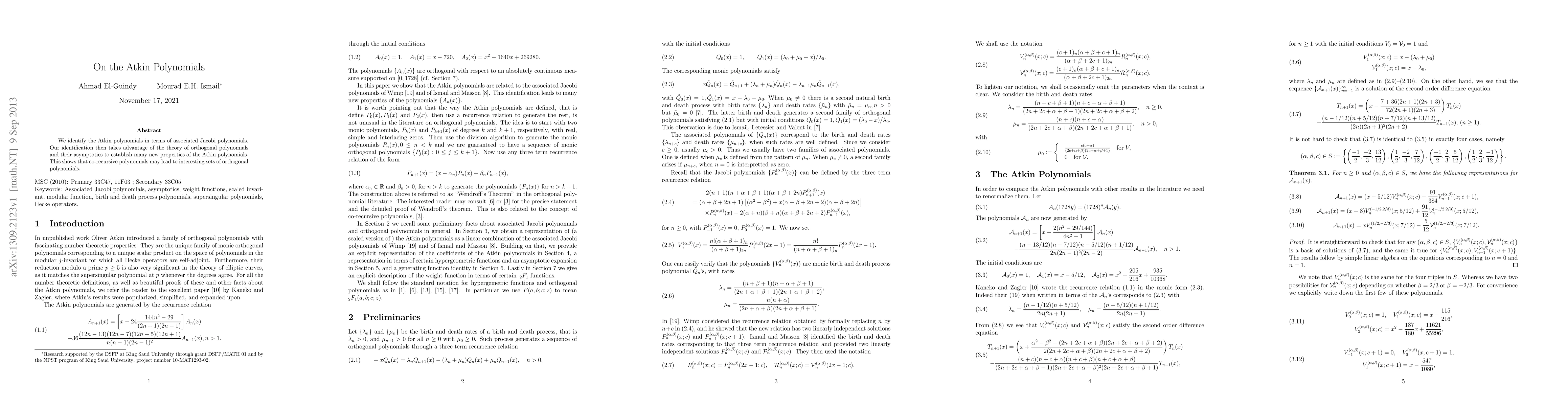 We identify the Atkin polynomials in terms of associated Jacobi polynomials. Our identificationthen takes advantage of the theory of orthogonal polynomials and their asymptotics to establish many new properties of the Atkin polynomials. This shows that co-recursive polynomials may lead to interesting sets of orthogonal polynomials.