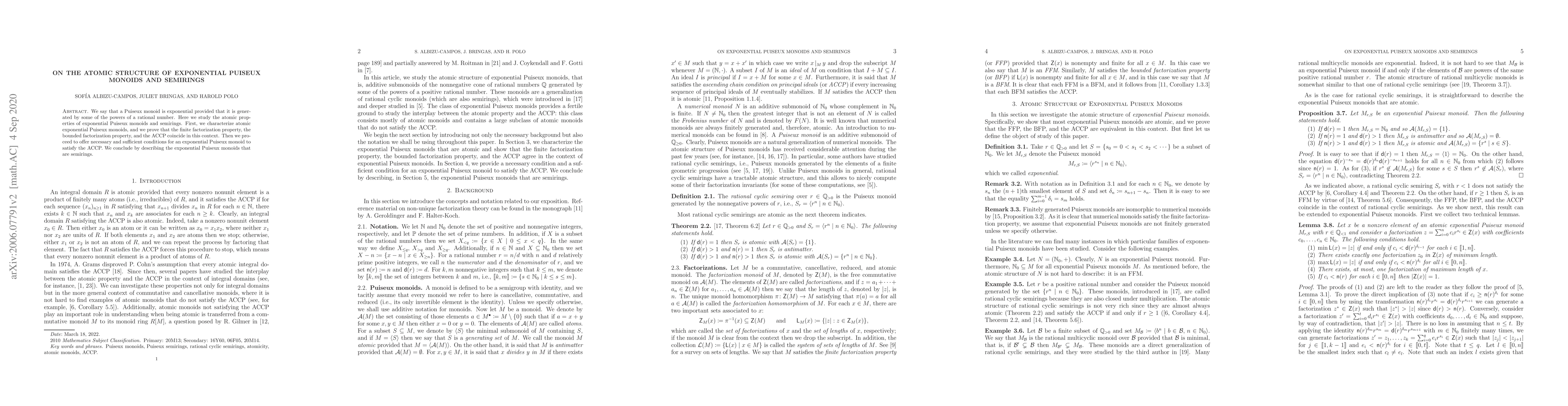 A Puiseux monoid is an additive submonoid of the nonnegative cone of the rational numbers. We say that a Puiseux monoid $M$ is exponential provided that there exist a positive rational $r$ and a set $S$ consisting of nonnegative integers, which contains $0$, such that $M$ is generated by the set $\{r^s \mid s \in S\}$. If $M$ is multiplicatively closed then we say that $M$ is an exponential Puiseux semiring. Here we study the atomic properties of exponential Puiseux monoids and semirings. First, we characterize atomic exponential Puiseux monoids, and we prove that the finite factorization property, the bounded factorization property, and the ACCP coincide in this context. Then we proceed to offer a necessary condition and a sufficient condition for an exponential Puiseux monoid to satisfy the ACCP. We conclude by describing the exponential Puiseux monoids that are semirings.