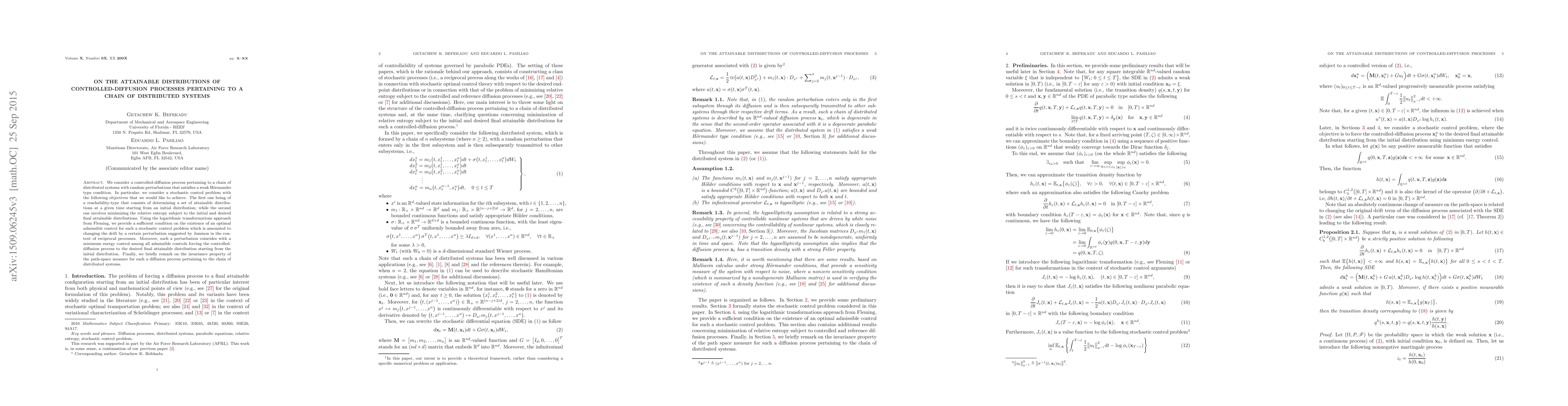 This paper explores controlled-diffusion processes for a chain of distributed systems under random perturbations, focusing on determining attainable distributions and minimizing relative entropy. It provides a sufficient condition for optimal control existence and identifies a minimum energy control, concluding with remarks on the invariance property of the path-space measure.