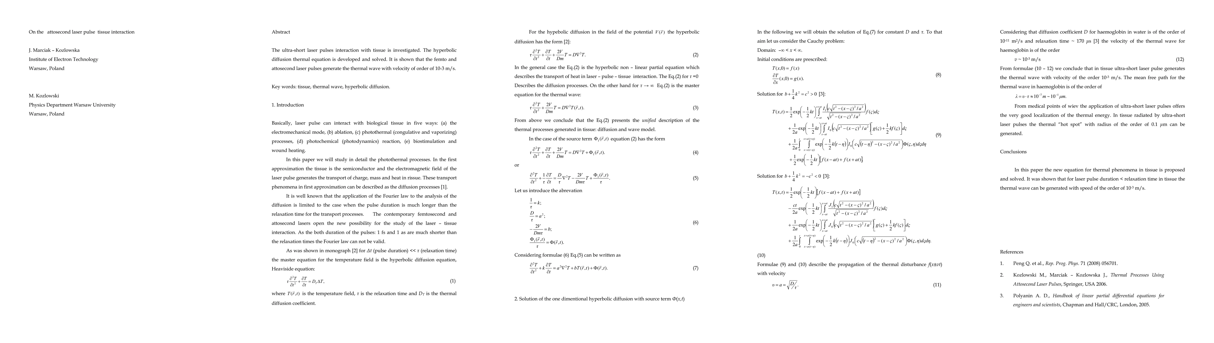 This paper investigates the interaction of attosecond laser pulses with tissue, formulating and solving a master equation to calculate the thermal relaxation time and speed of thermal waves within the tissue.