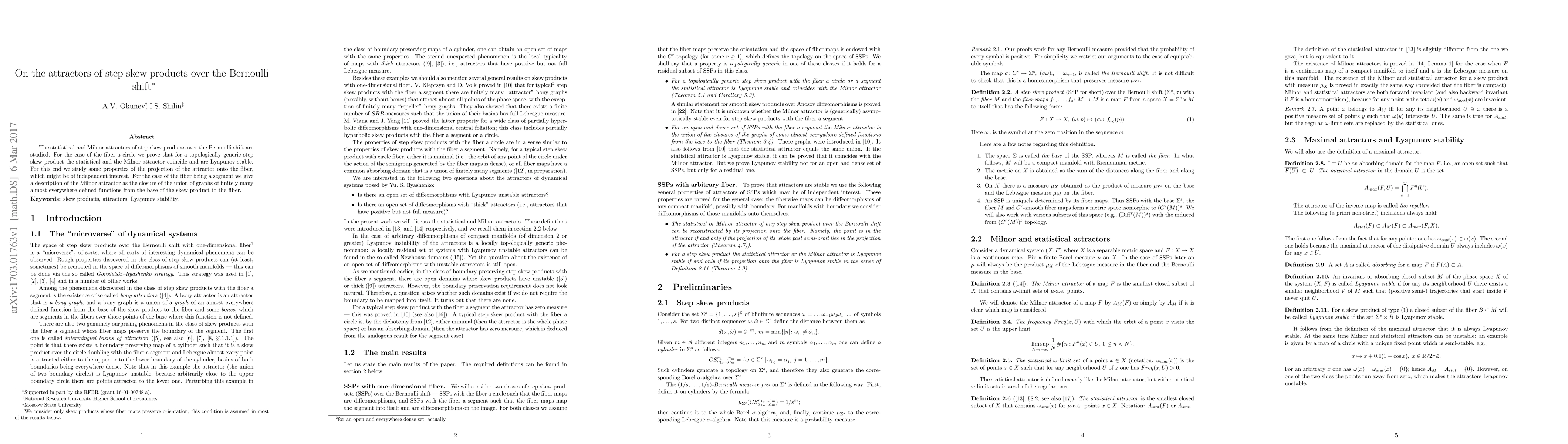 This paper investigates the statistical and Milnor attractors of step skew products over the Bernoulli shift, proving that for a topologically generic step skew product with a circular fiber, the statistical and Milnor attractors coincide and are Lyapunov stable. It also describes the Milnor attractor for a segment fiber as the closure of the union of graphs of almost everywhere defined functions.