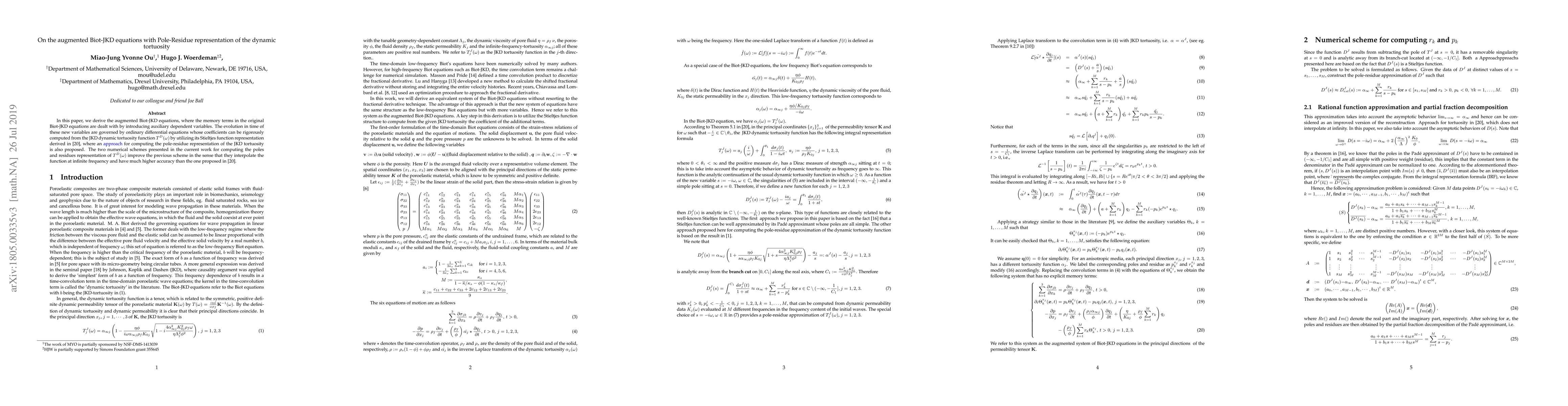 In this paper, we derive the augmented Biot-JKD equations, where the memory terms in the original Biot-JKD equations are dealt with by introducing auxiliary dependent variables. The evolution in time of these new variables are governed by ordinary differential equations whose coefficients can be rigorously computed from the JKD dynamic tortuosity function $T^D(\omega)$ by utilizing its Stieltjes function representation derived in \cite{ou2014on-reconstructi}, where an algorithm for computing the pole-residue representation of the JKD tortuosity is also proposed. The two numerical schemes presented in the current work for computing the poles and residues representation of $T^D(\omega)$ improve the previous scheme in the sense that they interpolate the function at infinite frequency and have much higher accuracy than the one proposed in \cite{ou2014on-reconstructi}.