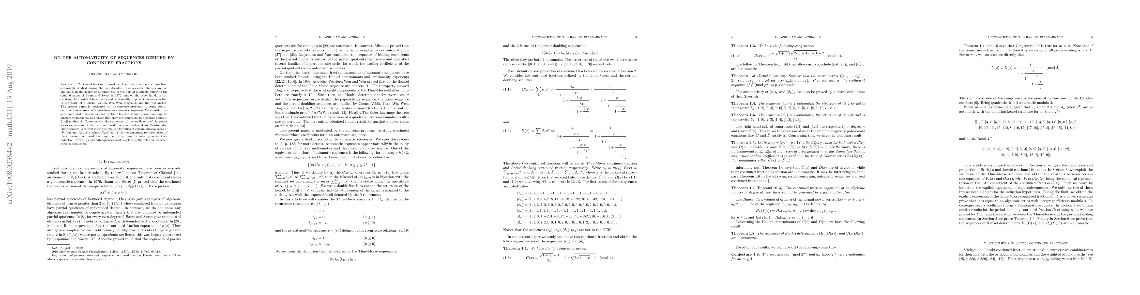 This paper explores continued fractions whose elements form automatic sequences, specifically those defined by the Thue-Morse and period-doubling sequences. It proves that these continued fractions are congruent to algebraic series modulo $4$, showing that their coefficient sequences are $2$-automatic.