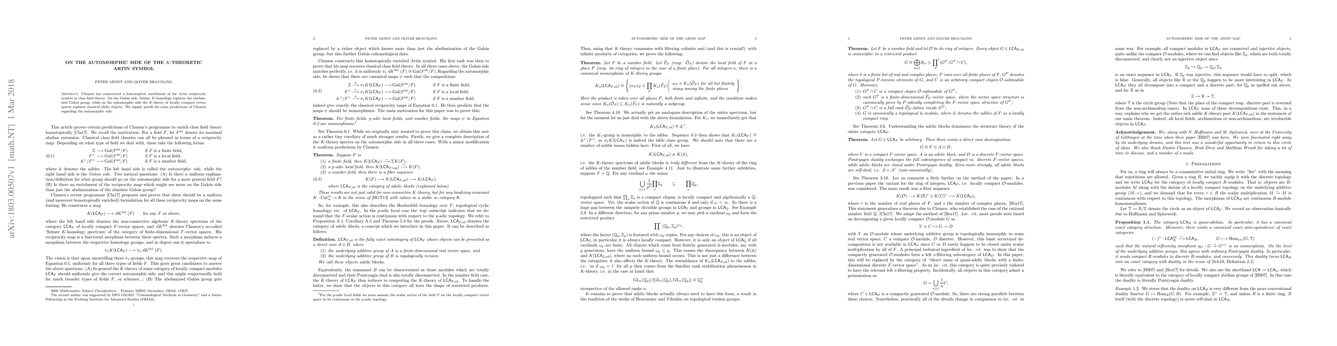 Clausen has constructed a homotopical enrichment of the Artin reciprocity symbol in class field theory. On the Galois side, Selmer K-homology replaces the abelianized Galois group, while on the automorphic side the K-theory of locally compact vector spaces replaces classical idelic objects. We supply proofs for some predictions of Clausen regarding the automorphic side.
