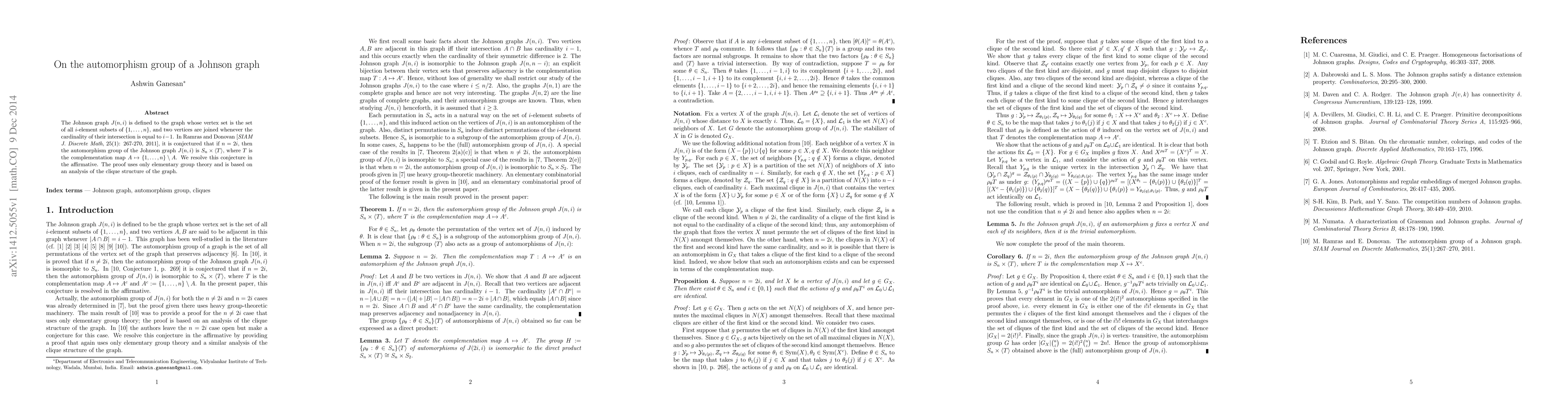 Researchers resolve a conjecture about the automorphism group of Johnson graphs, proving that their automorphism groups are $S_n imes ext{complementation map}$ when n is even.