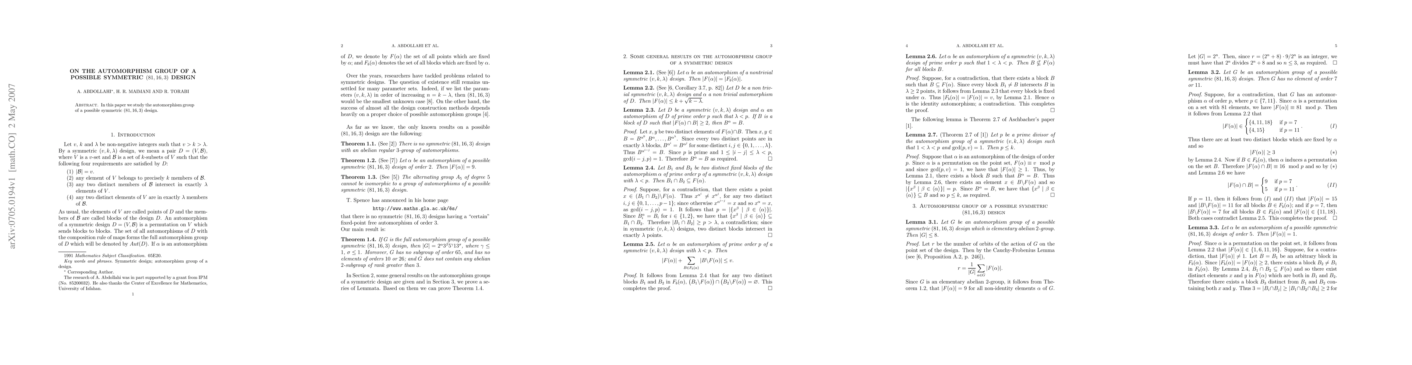 In this paper we study the automorphism group of a possible symmetric $(81,16,3)$ design.