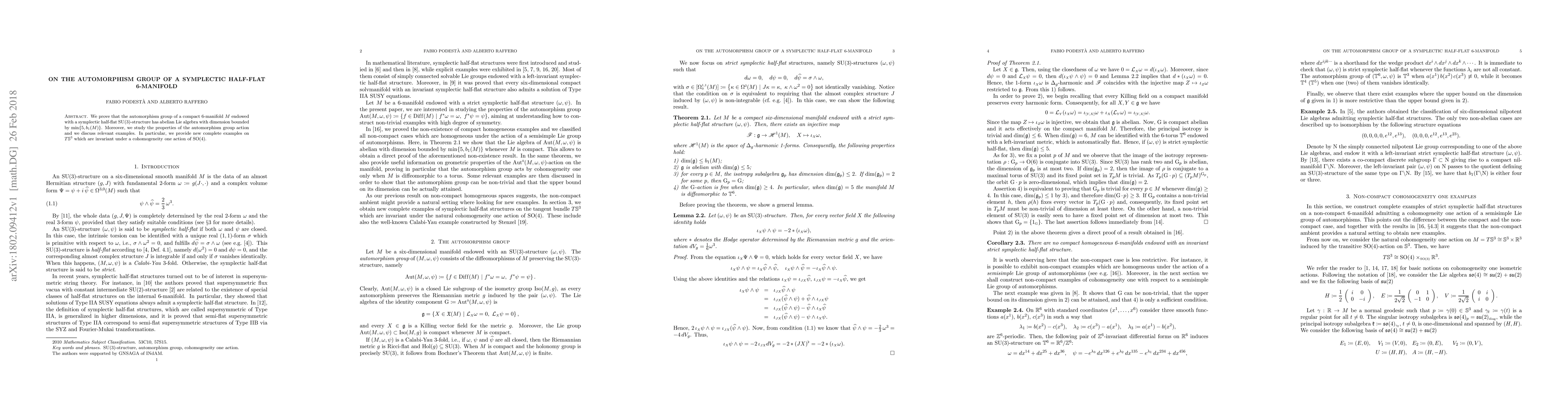 This paper proves that the automorphism group of a compact symplectic half-flat 6-manifold with an SU(3)-structure has an abelian Lie algebra with a dimension bounded by min$\{5,b_1(M)\}$. It also explores the properties of the automorphism group action and provides new examples on $T\mathbb{S}^3$ invariant under an SO(4) cohomogeneity one action.