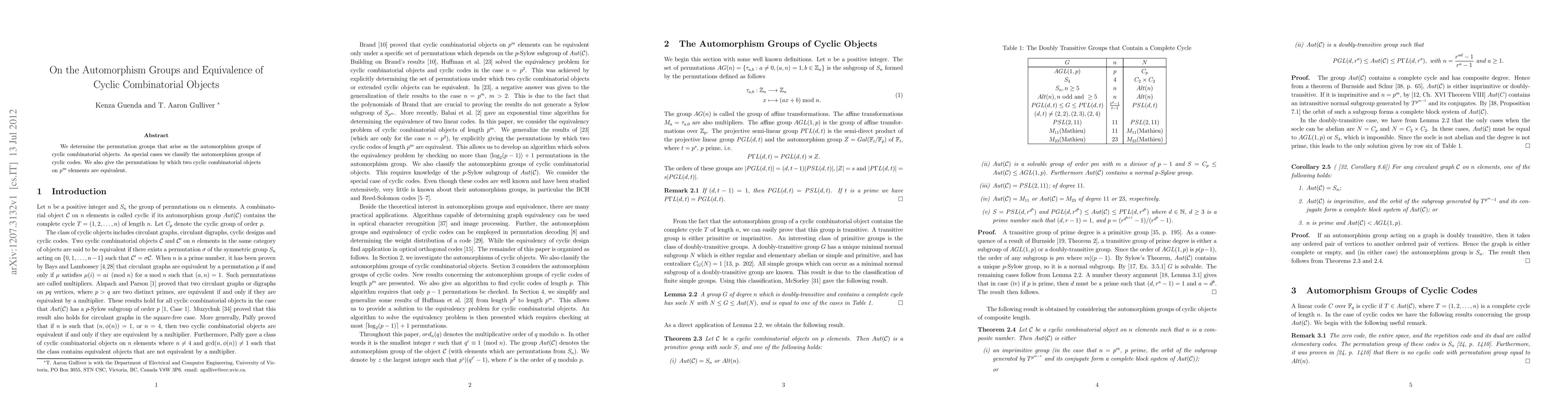 This paper identifies permutation groups acting as automorphism groups for cyclic combinatorial objects, specifically classifying those for cyclic codes. It also provides the permutations that establish equivalence between cyclic combinatorial objects on $p^m$ elements.