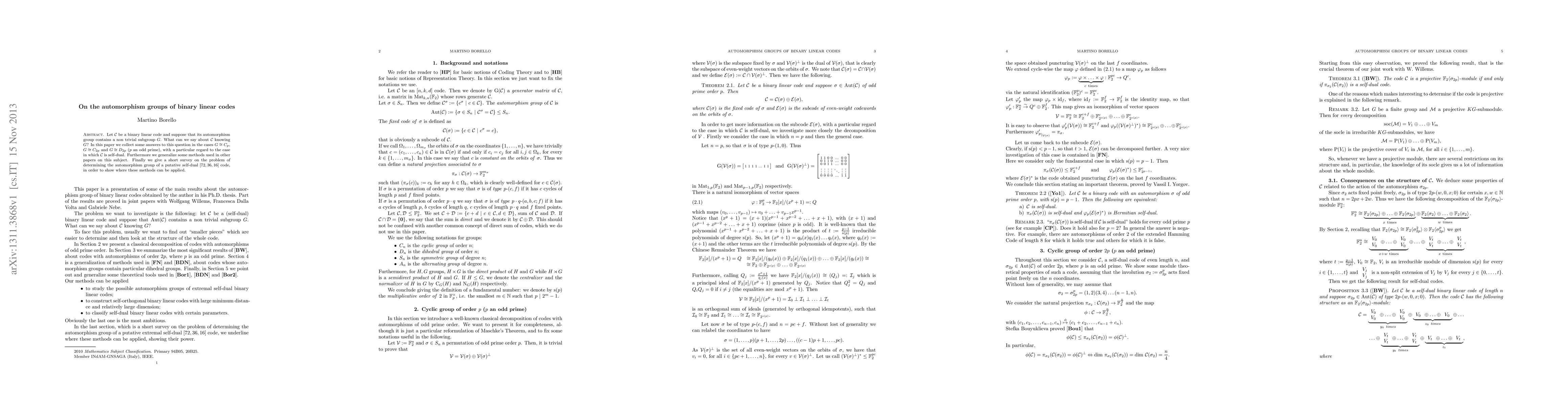 Let C be a binary linear code and suppose that its automorphism group contains a non trivial subgroup G. What can we say about C knowing G? In this paper we collect some answers to this question in the cases G=C_p, G=C_2p and G=D_2p (p an odd prime), with a particular regard to the case in which C is self-dual. Furthermore we generalize some methods used in other papers on this subject. Finally we give a short survey on the problem of determining the automorphism group of a putative self-dual [72,36,16] code, in order to show where these methods can be applied.